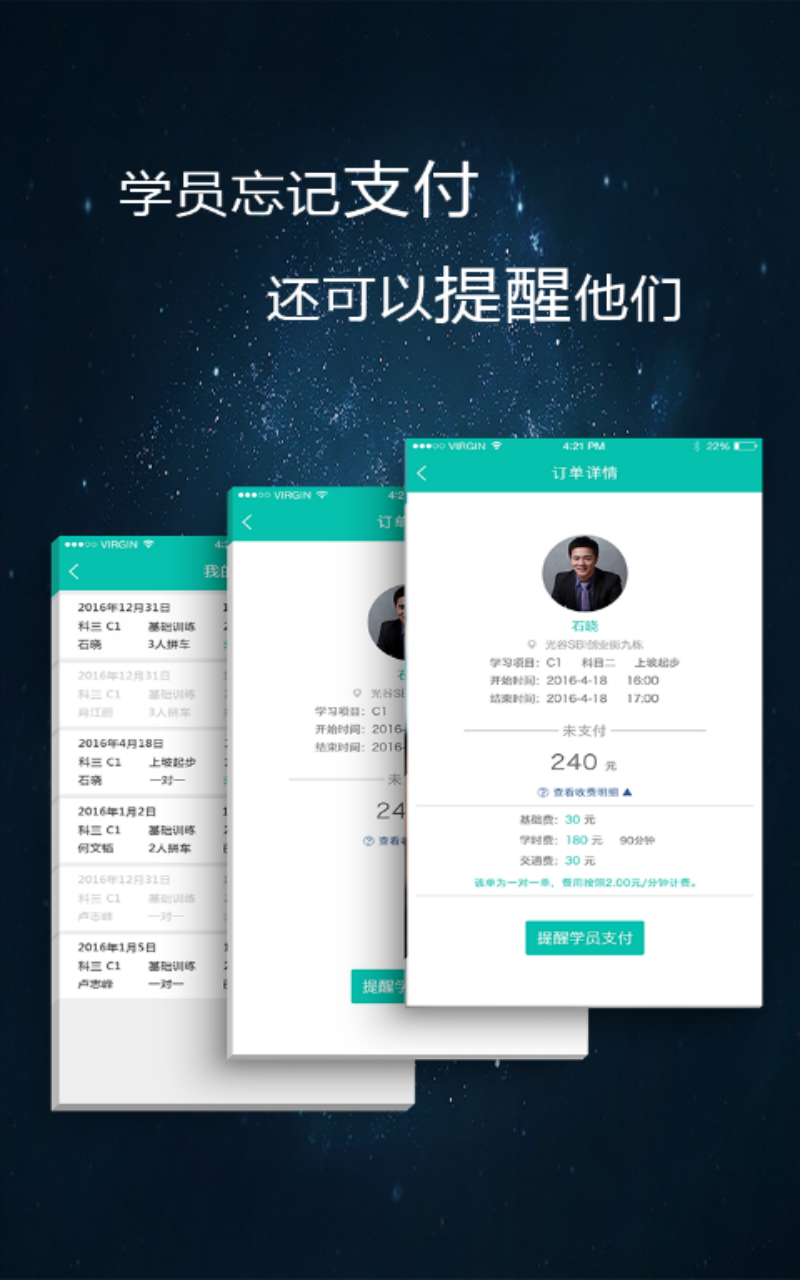 針對附近學(xué)員下的訂單進(jìn)行可選性接單,訂單完成后可以進(jìn)行雙向評價。目前三十多個訓(xùn)練場的大多數(shù)教練已經(jīng)加入我們,都是素質(zhì)高的金牌教練,您是否也想成為其中一員?不僅能夠在基本工資的基礎(chǔ)上獲得一筆額外不菲的收入,還能帶給千萬學(xué)員舒適的教育和放心,趕緊聯(lián)系我們的客服加盟吧!