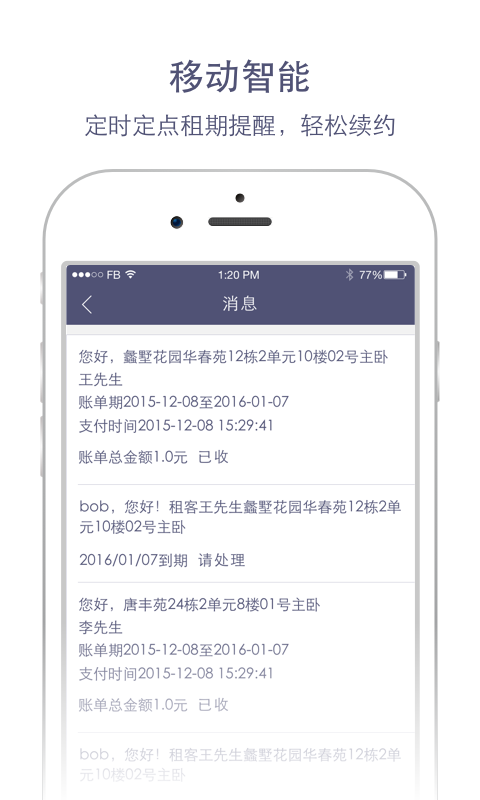 賬單管理:線上支付,輕松收租房源管理:分類(lèi)查詢(xún),智能列表