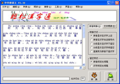 中華拼讀王是一款非常強大的漢字拼讀軟件,您可以導入本地的文本文件,也可以手動錄入,軟件會自動對您輸入的漢字標注拼音,幫助您學習漢語,軟件內(nèi)置語音引擎,可以非常準確清晰的將您輸入的內(nèi)容朗讀出來,讓您掌握正確的發(fā)音。【軟件特點】