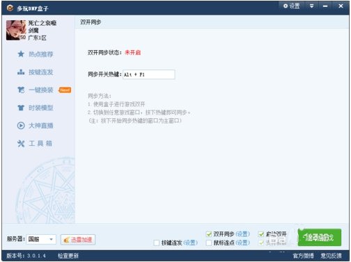 6、進(jìn)入游戲后在任意游戲一個(gè)窗口按下同步開關(guān)的熱鍵即可一鍵同步操作兩個(gè)窗口的角色,而那個(gè)窗口也就作為主窗口,主窗口可以隨意切換,但在這之前需要再次按下開關(guān)熱鍵關(guān)閉同步功能。