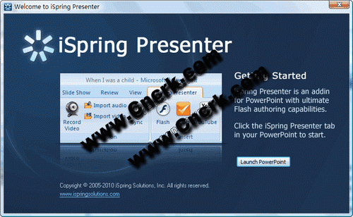 iSpring Presenter V5.0 英文綠色免費(fèi)版 iSpring Presenter主要用來(lái)將現(xiàn)有的PowerPoint演示文稿轉(zhuǎn)為Flash格式,且不論多復(fù)雜的演示文稿,iSpring Presenter都能保存原有的演示文稿外觀和效果,PPT演示文稿一旦轉(zhuǎn)檔為Flash動(dòng)畫(huà)之后,就能更方便的發(fā)布、分享演示文稿,F(xiàn)lash格式也能更容易被各種不同的網(wǎng)頁(yè)瀏覽器和操作系統(tǒng)使用