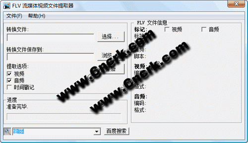 FLV流媒體視頻文件提取器 V3.0 簡體中文綠色免費版 要從視頻中提取其中的歌曲嗎?或者需要FLV文件中的單獨圖像文件? 使用FLV文件提取器,可以幫您解決這個問題。軟件界面簡潔,人性化的的程序設(shè)計,使您操作更簡便。轉(zhuǎn)換后生成的MP3文件與原FLV文件同名,視頻文件則統(tǒng)一使用 video.avi 名稱。而且本軟件自帶百度搜索框,可以很方便搜索感興趣的各種視頻文件