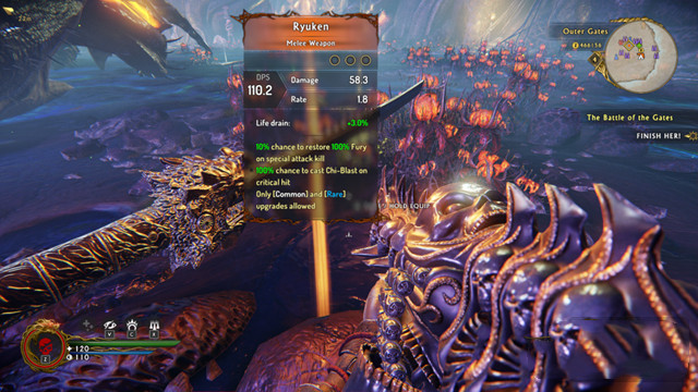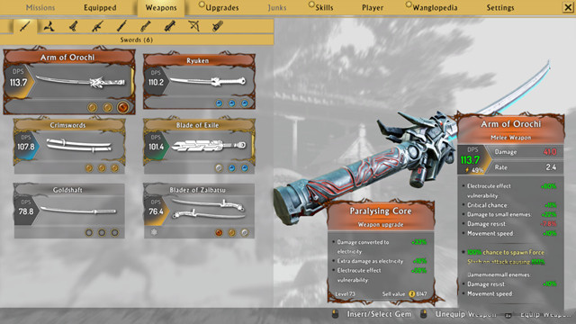 用一百種方法殺死惡魔之后,我們的收獲必須是非常豐富的。在高難度下,殺死強大的敵人除了能夠獲得強大的新武器之外,最重要的便是能夠獲得形形色色的寶石來強化武器,這也是武器系統(tǒng)的另外一個核心:寶石鑲嵌強化系統(tǒng)。一般來講,每件武器都有三個寶石槽,插上符合武器特點的寶石之后,能夠有效地提高武器的特性,讓戰(zhàn)斗更加高效。后期開放的寶石合成系統(tǒng)能夠把多余的寶石合成升級,游戲中個別暗金寶石更是有著逆天特效(是不是很有網游的既視感?。械纳踔聊軌蜃尳鼞?zhàn)傷害提高30%,高難度下一把武士刀通關絕對不是夢!