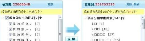 5、克隆的時(shí)候選擇要克隆的內(nèi)容,選擇克隆的內(nèi)容也就是選擇你要克隆的好友分組以及某個(gè)群主,只需在頁(yè)面左邊被克隆號(hào)碼中勾上要克隆的內(nèi)容即可;