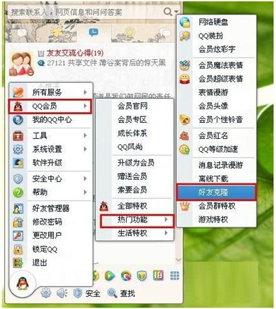 2、下一步選擇主菜單中的QQ會(huì)員---熱門功能---好友克隆的選項(xiàng),進(jìn)入到好友克隆的頁(yè)面中去;