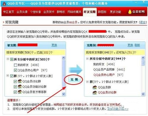 3、下一步來(lái)到QQ會(huì)員專區(qū)中,選擇好友克隆的選項(xiàng)就可以啦;