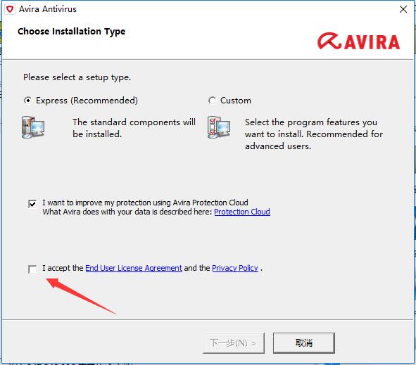 3、勾選紅色箭頭處的接受條款選項,點擊下一步。