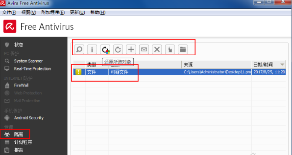 2、在“隔離”界面就可以看到小紅傘隔離的所有文件了,在這里還可以還原以及刪除這些文件;