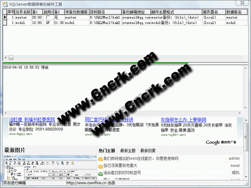 數(shù)據(jù)庫備份郵件工具 V2.2 簡體中文綠色免費版 本工具能對SQL Server數(shù)據(jù)庫自動備份,支持多任務(wù)備份,壓縮后發(fā)到您的郵箱。強(qiáng)烈建議安裝在數(shù)據(jù)庫服務(wù)器上,否則僅能備份,不能發(fā)送郵件。首次運行請先配置相關(guān)參數(shù)。本工具完全免費,不保證郵件百分百發(fā)送成功