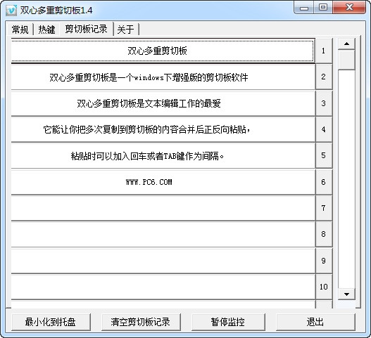 雙心多重剪切板是一個windows下增強版的剪切板軟件,雙心多重剪切板是文本編輯工作的最愛,它能讓你把多次復(fù)制到剪切板的內(nèi)容合并后正反向粘貼,粘貼時可以加入回車或者TAB鍵作為間隔。【軟件特點】