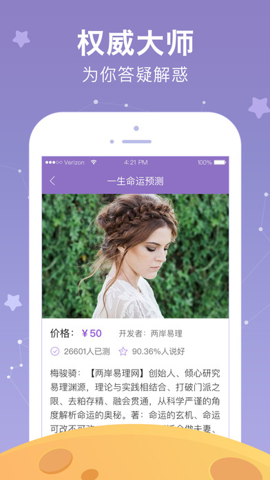 主要功能——【星座運勢】每日零時更新最新最權(quán)威星座運勢,可定制專屬星座運勢,隨時隨地了解開運指南,把好運隨身攜帶【星盤解讀】最全面的個人星盤解讀,多角度為你詮釋 【星座資訊】訂閱星座趣聞,滿足你的個性化需求【算命工具】權(quán)威大師為你答疑解惑,準(zhǔn)到讓你尖叫