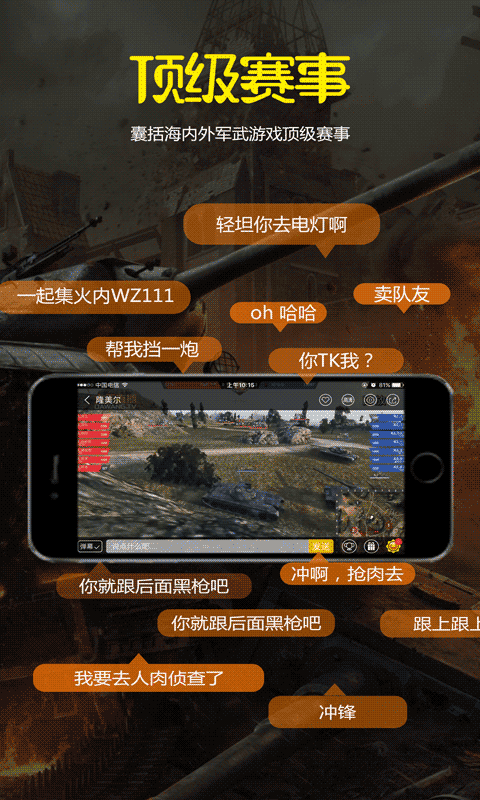 超多《坦克世界》、《戰(zhàn)艦世界》等游戲的賽事直播,“羊駝”、“納蘭”、“戰(zhàn)場”及”紫楓”等知名主播傾情加盟,更有國內(nèi)知名軍事大咖,閃耀登場,還在等什么?一起來嗨吧!~