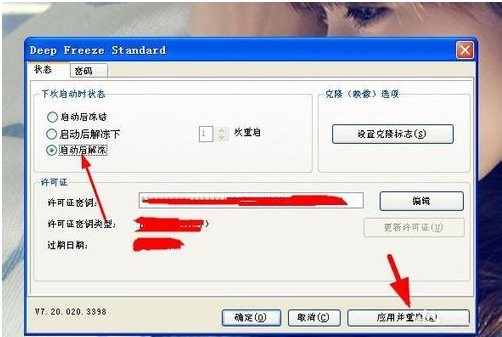 3、選擇啟動后解凍,然后選擇應用并重啟。