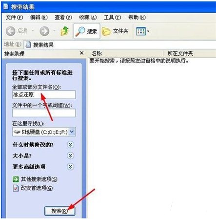6、如果不知道安裝包在哪,可以點擊電腦的開始菜單,選擇搜索,在全部或部分文件名輸入冰點還原,進行搜索文件。