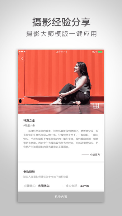 小蟻微單相機(jī)敏感捕捉小白們的痛點(diǎn),推出撩妹神器大師隨行,這里提供的人像模融合業(yè)界知名人像攝影大師的經(jīng)驗(yàn),相機(jī)可根據(jù)模板自動(dòng)設(shè)定對應(yīng)的拍攝參數(shù),你需要做的僅僅是按提示框引導(dǎo)女神擺好姿勢,按下快門,搖身一變成為攝影高手!
