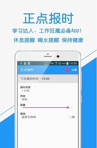 《正點(diǎn)報時》可以在每隔1小時,振動響鈴提醒您休息喝水,在學(xué)習(xí)、工作之余還能保證您的身體健康!