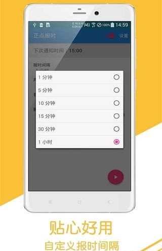 1、支持自定義報時提醒間隔2、支持自定義提醒鈴音