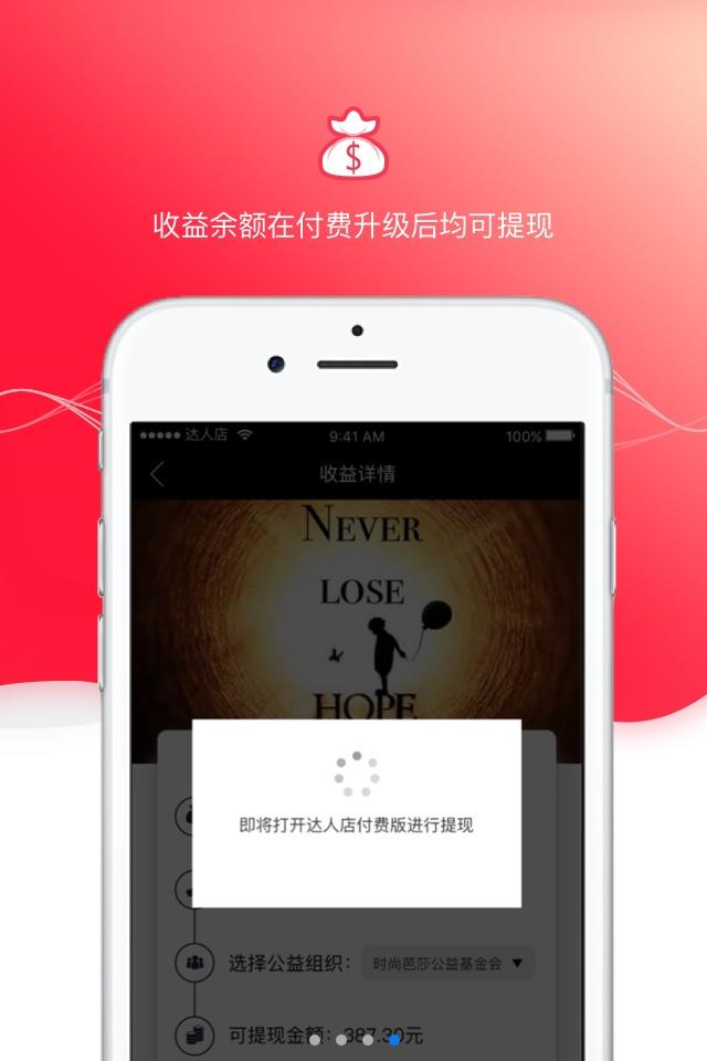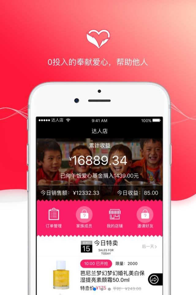 2、達(dá)人店與多家著名公益組織合作,店主可以選擇將所得收益進(jìn)行捐款,0投入的奉獻(xiàn)愛(ài)心,幫助他人。