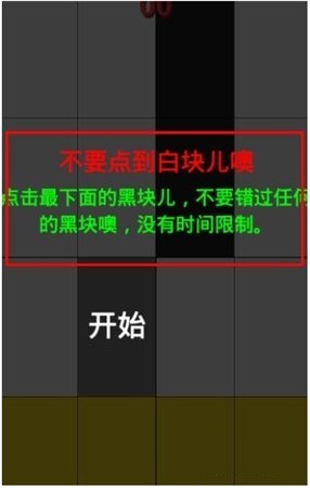 進(jìn)入游戲后會(huì)顯示黑塊和白塊,不要點(diǎn)到白塊的地方就算是過(guò)了。點(diǎn)擊【開(kāi)始】