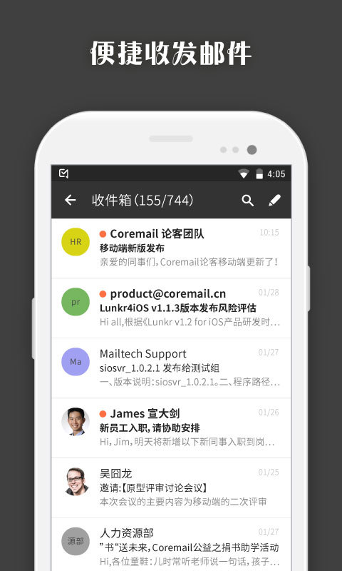 Coremail論客app是一款效率辦公應(yīng)用,Coremail論客app為用戶提供便捷的郵件收發(fā)功能,提升用戶辦公溝通效率。【軟件特點】