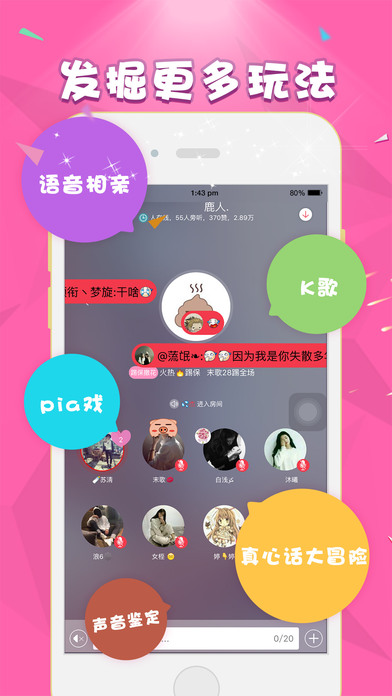 多人聊天室:多人實(shí)時(shí)語(yǔ)音,在線K歌、真心話大冒險(xiǎn)、相親、電臺(tái)、殺人游戲等多種玩法,還支持圖文互動(dòng),快速融入結(jié)交新朋友。精彩錄音:聲音防腐劑,歡樂(lè)留聲機(jī),在多人聊天室記錄下屬于你們的美好回憶。