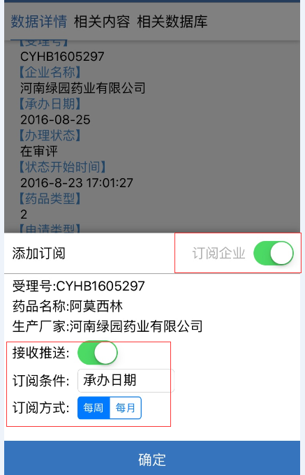 藥智數(shù)據(jù)APP新增訂閱功能,你只需添加受理號或企業(yè),即可隨時(shí)關(guān)注相關(guān)藥品注冊審評動(dòng)態(tài)(注:此功能為VIP會員特權(quán))。點(diǎn)擊藥品注冊數(shù)據(jù)庫詳情頁面右下角的訂閱圖標(biāo):1,可直接以藥品受理號訂閱,即可訂閱該受理號的注冊信息。勾選接收推送,可接收訂閱消息通知;2,可點(diǎn)擊訂閱企業(yè)出,即可訂閱該企業(yè)的藥品注冊信息。可選擇訂閱條件:全部/承辦日期/狀態(tài)開始日;訂閱方式:每周/每月。