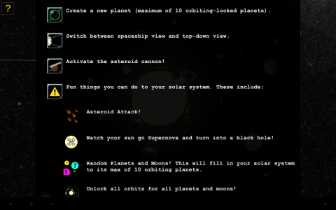 《行星建造者 Planet Builder》是由Liquid City Software提供的一款模擬建造游戲。你將扮演創(chuàng)世神的角色,去構(gòu)建行星和衛(wèi)星,并定義它們,諸如名稱,大小,軌道速度,旋轉(zhuǎn)速度,傾斜,戒指,軌道距離和外觀屬性。 想要讓事情變得有趣?按小行星攻擊鍵,看著小行星撞擊你的行星并使它脫離脫離軌道!
