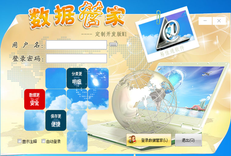易佳通-數(shù)據(jù)管家定制開發(fā)版M1是一款功能強(qiáng)大的遠(yuǎn)程企業(yè)文檔管理軟件,軟件方便用戶將企業(yè)信息或個(gè)人數(shù)據(jù)分類保存,打包到軟件中,防止企業(yè)或個(gè)人信息被外部竊取。軟件具有文檔格式轉(zhuǎn)換功能,用戶可以直接復(fù)制網(wǎng)頁、Word、Excel、文本等文檔到軟件的編輯器中,軟件會(huì)自動(dòng)進(jìn)行格式轉(zhuǎn)換,保留原文檔的樣式。軟件具有文檔編輯器,提供豐富的編輯功能,用戶可以將文本、圖片、文件或語音保存到軟件中,保存文檔后圖片和本地文件會(huì)自動(dòng)加密保存到數(shù)據(jù)庫;用戶可在文章任意位置插入文字、表格、層、圖片、文件、鏈接、語音留言等,并可對其樣式進(jìn)行設(shè)置。軟件可將用戶數(shù)據(jù)分類明細(xì)的保存,并提供了豐富的搜索查詢功能,用戶可以很容易的檢索數(shù)據(jù)信息;用戶可將軟件中的文章標(biāo)注或互相鏈接。軟件提供模板支持,用戶可將固定的文檔編輯格式保存為模板,需要時(shí)在編輯器載入即可,避免重復(fù)編輯,提高效率。軟件提供了豐富的界面布局和主題,用戶可以任意設(shè)置軟件中窗口的布局,字體的大小,并可以保存用戶自定義布局;軟件提供了多種界面主題,用戶可對軟件的顏色和外觀做出多種選擇;軟件的工具欄可以自定義,用戶可以根據(jù)使用習(xí)慣任意增加或刪除工具欄。
