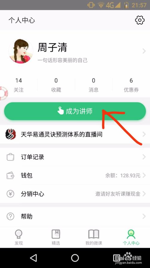 進入"個人中心"頁面后,點擊中間的綠底欄的“成為講師”四個字。