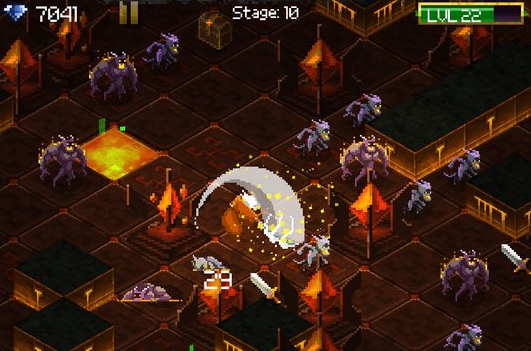 這個(gè)游戲玩法十分簡單粗暴,點(diǎn)擊左屏幕向上移動(dòng),點(diǎn)擊右屏幕向右移動(dòng),你的角色會一路見怪砍怪,見錢撿錢,你需要做的就是不斷的拾取鉆石和武器升級你的能力,在地牢里一路殺到底。注意千萬不要碰到地面的陷阱,當(dāng)然反應(yīng)太慢也不行,你身后的地面會不斷塌陷,只有不斷準(zhǔn)確又快速地前進(jìn)才能在這個(gè)兇險(xiǎn)的地牢里殺出一條血路。與此同時(shí),你還有很多特別的角色可以選擇,比如狗夜叉呀肛道夫之類的。