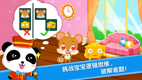 開動(dòng)腦筋,巧妙安排房間,解決小動(dòng)物之間的矛盾!開拓寶寶思維,鍛煉邏輯能力,開發(fā)寶寶智力~寶寶小店長(zhǎng),等你來(lái)挑戰(zhàn)哦!奇奇開了間小旅館,小動(dòng)物們來(lái)住房??墒?,怎樣妥善安排房間讓小動(dòng)物們和睦相處是個(gè)大問(wèn)題!小老鼠皮皮最怕藍(lán)貓啦,小小骨頭怕狗狗,奶酪和老鼠要分開,藍(lán)貓要把魚兒抓,貓狗不能放一起!那小老鼠要住哪?小狗狗要住哪...開動(dòng)腦筋幫奇奇想想辦法解決難題吧!