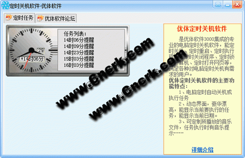 優(yōu)體定時關機軟件 V1.25 簡體中文綠色免費版 定時關機軟件-優(yōu)體軟件3000 是優(yōu)體軟件集成的專業(yè)的電腦定時關機軟件、電腦自動關機軟件、能定時關機、定時重啟、定時執(zhí)行程序、定時關閉程序、定時鎖定計算機、定時打開網頁等,滿足各種對電腦定時關機有需求的用戶