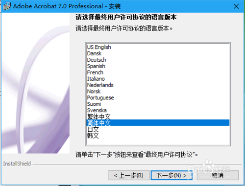 在Adobe Acrobat 7.0 Professional安裝窗口點(diǎn)擊下一步,請(qǐng)選擇最終用戶許可協(xié)議的語(yǔ)言版本默認(rèn)簡(jiǎn)體中文,點(diǎn)擊下一步。