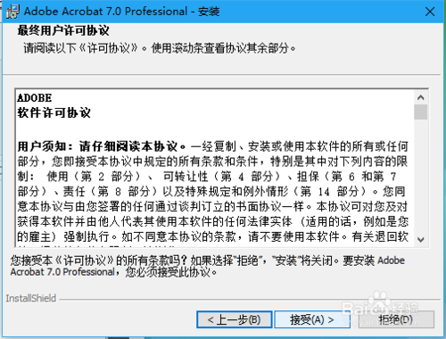 在Adobe Acrobat 7.0 Professional安裝窗口點(diǎn)擊下一步—>在最終用戶許可協(xié)議點(diǎn)擊接受。