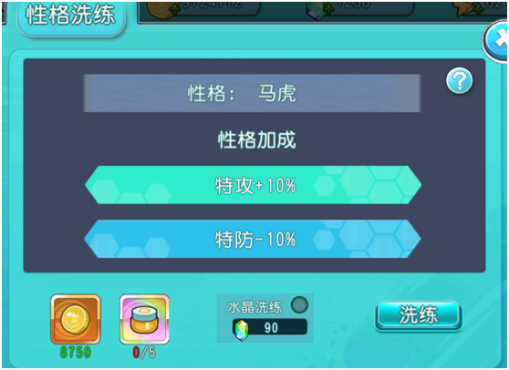 2、 性格洗練將消耗性格轉(zhuǎn)換蜜和金幣,若進(jìn)行水晶洗練則只消耗水晶。