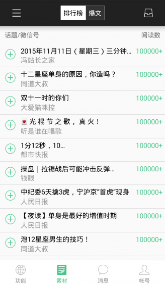 6、龐大的文章資源庫,包括文章排行榜、黑馬爆文、我關(guān)注的公眾號文章??蓪⑽恼绿砑拥胶铣善?,快速合成素材