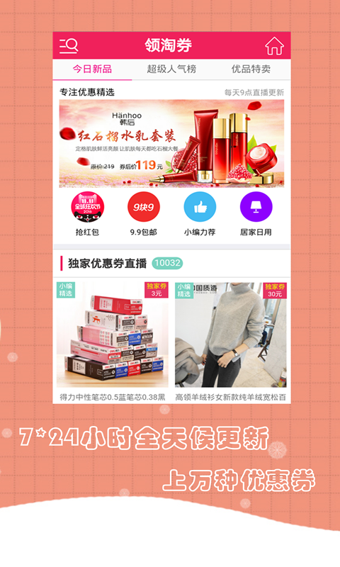 領(lǐng)淘券是一個專業(yè)的優(yōu)惠券發(fā)放平臺,7*24小時全天候不間斷更新,涵蓋全網(wǎng)的最新優(yōu)惠券信息!為您精選服飾、母嬰、化妝品、居家、鞋包配飾、美食、文體用品、數(shù)碼家電等熱門優(yōu)惠,上領(lǐng)淘券,省錢放心,先領(lǐng)券再下單,一省再省!