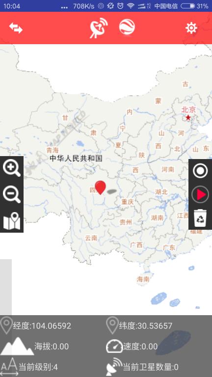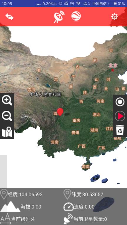 2、隨時顯示當前位置,顯示當前經(jīng)緯度信息,并提供衛(wèi)星數(shù)據(jù)、速度、海拔信息顯示。