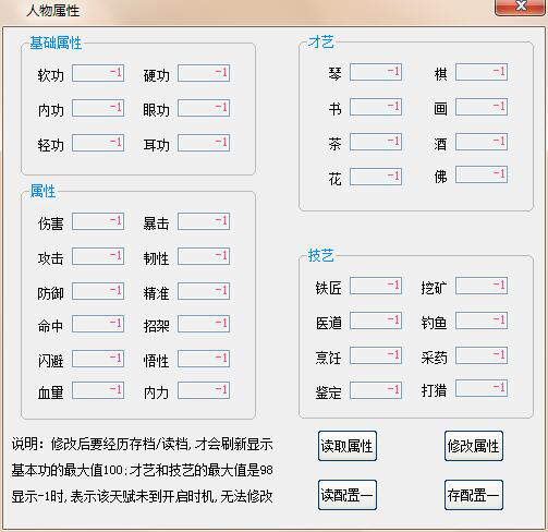 人物屬性:基礎(chǔ)屬性、才藝、技藝、點(diǎn)數(shù)、善惡值等。