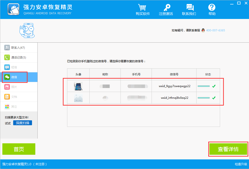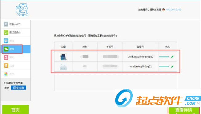 四、待軟件成功掃描后,點(diǎn)擊左側(cè)的“微信”選項(xiàng)。在右側(cè)選擇需要恢復(fù)數(shù)據(jù)的微信號(hào)后,點(diǎn)擊“查看詳情”。