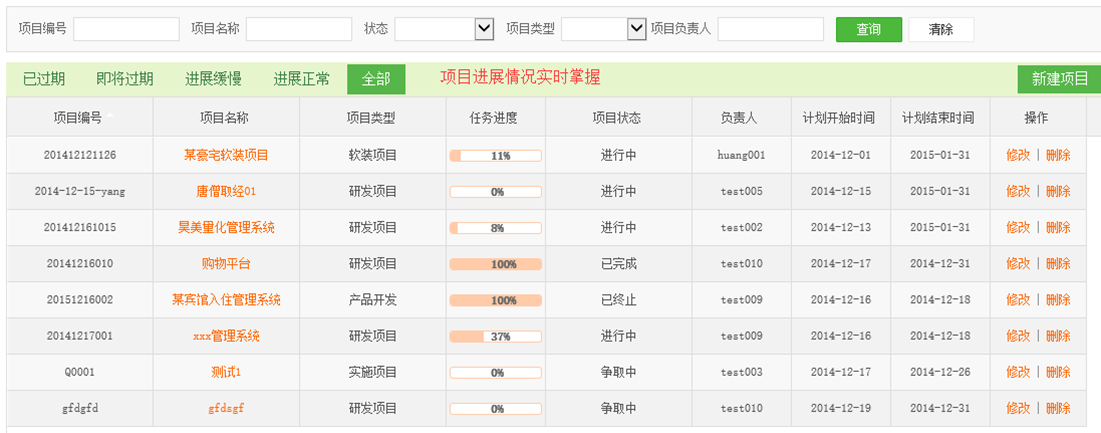 項目管理:對各類項目按進展情況分類管理,項目信息、項目進度、利潤預算、合同信息、審批記錄、變更記錄、項目文檔、項目成本等簡單明了,總覽各項目的情況。