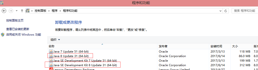 3. 在控制面板/程序卸載里面,把關(guān)于jdk1.8卸載了,再重裝。我之前把1.8和1.7 裝在同一個(gè)java目錄下,后來(lái)?yè)Q了個(gè)路徑