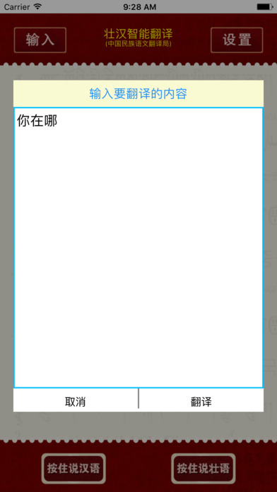 壯漢智能翻譯ios版是一款手機壯語翻譯軟件,支持壯語和漢語之間的快速翻譯,能夠方便壯族人們和外人們進行更好的溝通交流,對于促進雙方文化的學習也有很大的幫助。