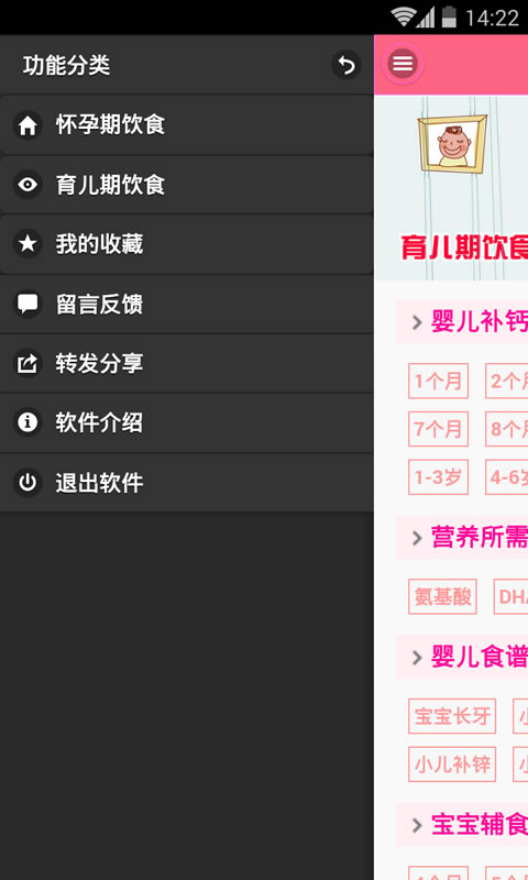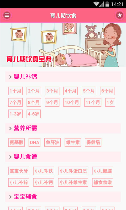 針對育兒期提供了:嬰兒補鈣、營養(yǎng)所需、嬰兒食譜、寶寶輔食、寶寶吃飯、兒童食療、寶寶四季飲食。