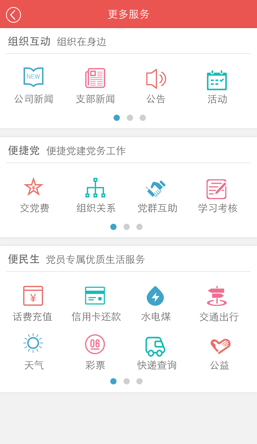 我的黨建:用戶審核加入線下對應(yīng)的黨組織,在應(yīng)用及時的收到重要的黨組織通知、三會一課通知,實現(xiàn)三會一課的掃描簽到,電子化學習資料分發(fā)、實現(xiàn)在app一鍵提交思想?yún)R報,交黨費等功能。