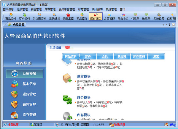 大管家商品銷售管理軟件是一款專業(yè)的銷售管理軟件,其中包含商品銷售管理系統(tǒng) ,庫存管理系統(tǒng)(倉(cāng)庫管理系統(tǒng)),財(cái)務(wù)和報(bào)表系統(tǒng)等子模塊。軟件界面設(shè)計(jì)簡(jiǎn)潔,美觀,其人性化的軟件流程,使普通用戶不需培訓(xùn)也能很快掌握軟件操作使用方法,上手極易。強(qiáng)大報(bào)表與集成查詢功能是本軟件的最大特色,所有功能在用戶需要的使用地方自然體現(xiàn),不用打開多個(gè)窗口重復(fù)查詢。適用于商貿(mào)公司,個(gè)體門店等用于商品銷售管理, 庫存管理,財(cái)務(wù)管理等,客戶管理,員工管理等場(chǎng)合,是您企業(yè)進(jìn)行信息化管理的強(qiáng)大工具。適用于商貿(mào)公司、批發(fā)零售等行業(yè)、店鋪,連鎖分店以及個(gè)人銷售管理等。【功能介紹】