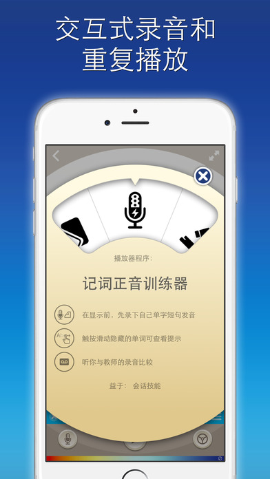◆ 最常用的單詞和短語,加上全部由母語者錄制的音頻。◆ 語音室輔助你掌握純正的發(fā)音。錄制你的發(fā)音,Nemo會前后播放你的發(fā)音和Nemo老師的發(fā)音,以做比較。你會驚異于你的發(fā)音的神速進步。