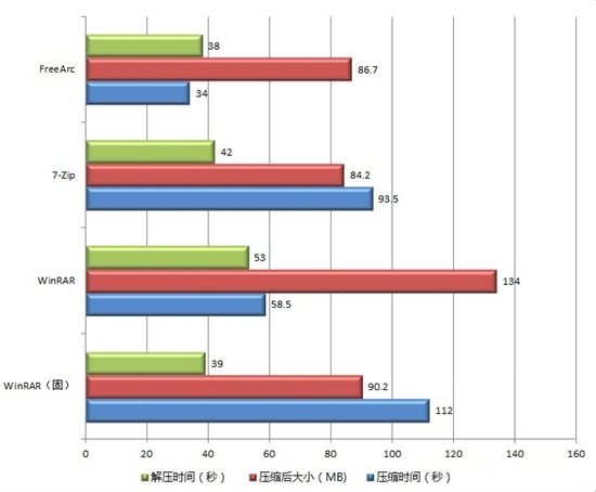 FreeArc壓縮時間為34秒,壓縮后的文件容量為86.7MB,解壓時間為38秒,解壓rar文件為37.5秒,解壓7Z文件為38秒。