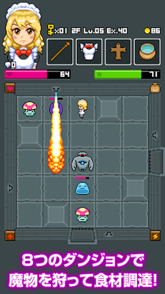 迎來了17歲生日的魔法少女,為了能早日成為厲害的魔女,告別了父母,離開了家鄉(xiāng),在第一次抵達(dá)的街道上開了一家飯店,但這個(gè)飯店可不簡單,它的主菜全部都是用魔物做的!身為美食家的國王和熱衷于討伐地下迷宮boss的勇者都對(duì)這個(gè)餐廳贊不絕口!因此,我們要幫助魔女小姐去地下迷宮打怪探險(xiǎn),獲取新鮮食材來為饑腸轆轆的人們作更加美味的魔物鍋飯,早日聞名世界!