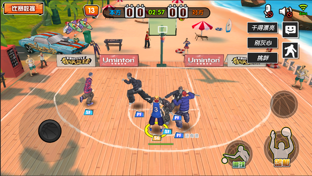 《街頭籃球》手游操控簡單,非常容易上手,通過屏幕左側(cè)搖桿控制方向,右側(cè)三個(gè)按鍵來完成進(jìn)攻時(shí)的投/扣籃、傳球、突破,以及防守時(shí)的籃板、盯防、搶斷。